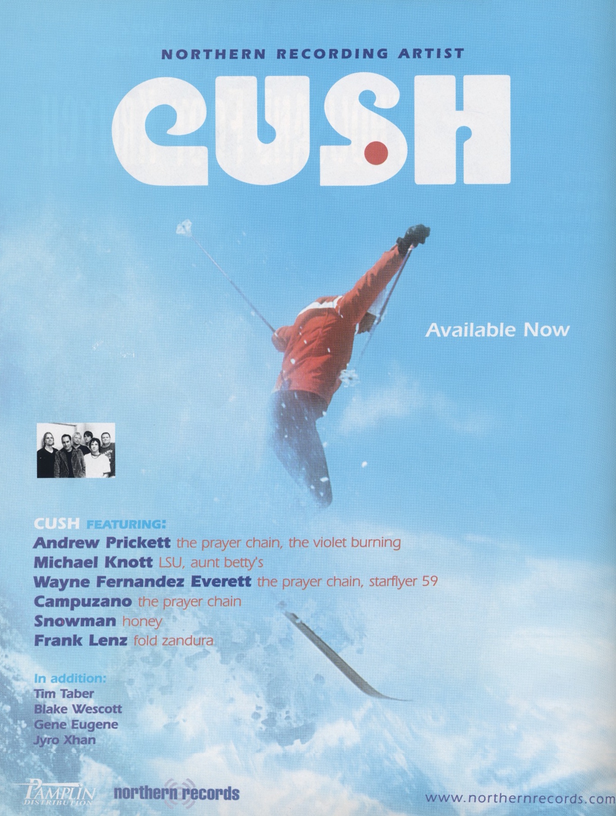 The self-titled debut album by the American band project Cush was released on Northern Records in July 2000, distributed by Pamplin Distribution. The album was created at The Green Room in Huntington Beach, California; 12/99-4/00. A collaboration project featuring a host of indie artists, including Michael Knott (who provides lead vocals), Andrew D. Prickett, Blake Wescott, Chris Colbert, Snowman, Eric Campuzano, Frank Lenz, Gene Eugene, Jason 71, Jeff Schroeder, Jyro, Tim Taber, and Wayne Everett.