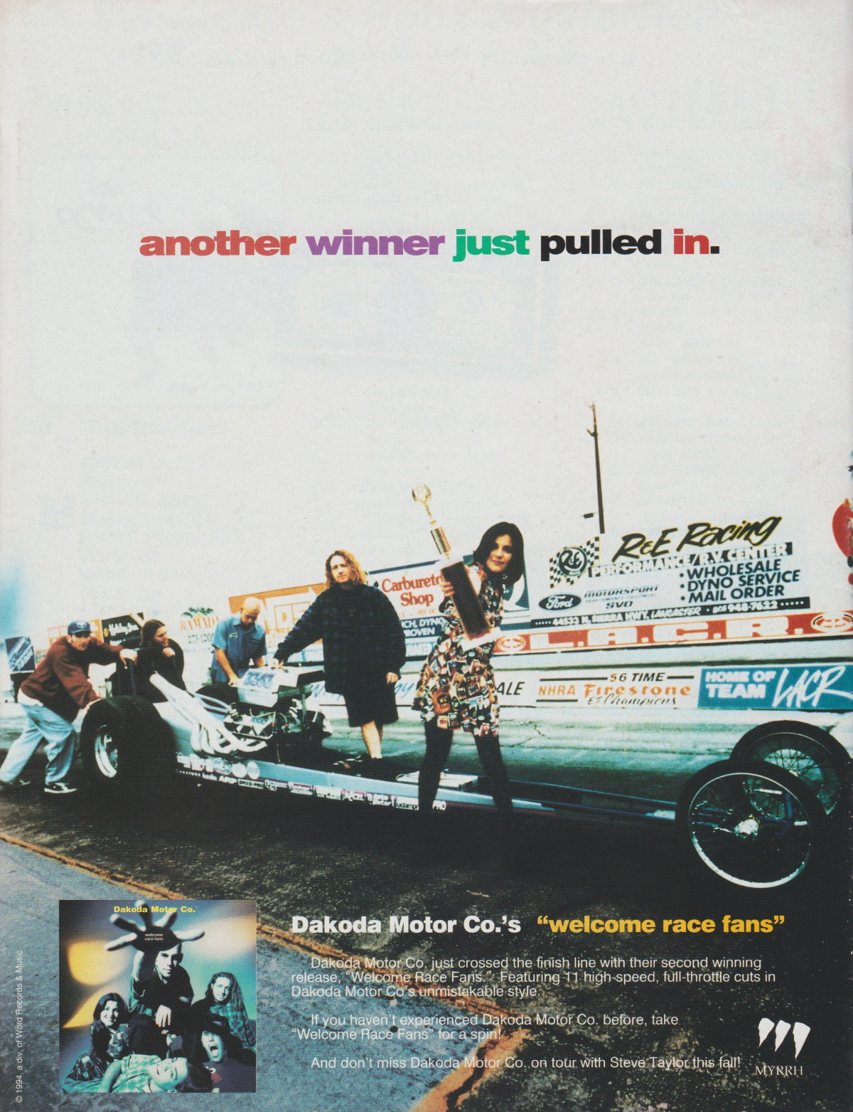 A full-page advertisement for the Dakoda Motor Co. album Welcome Race Fans was featured on the back cover of the July 1994 issue of Syndicate Magazine.