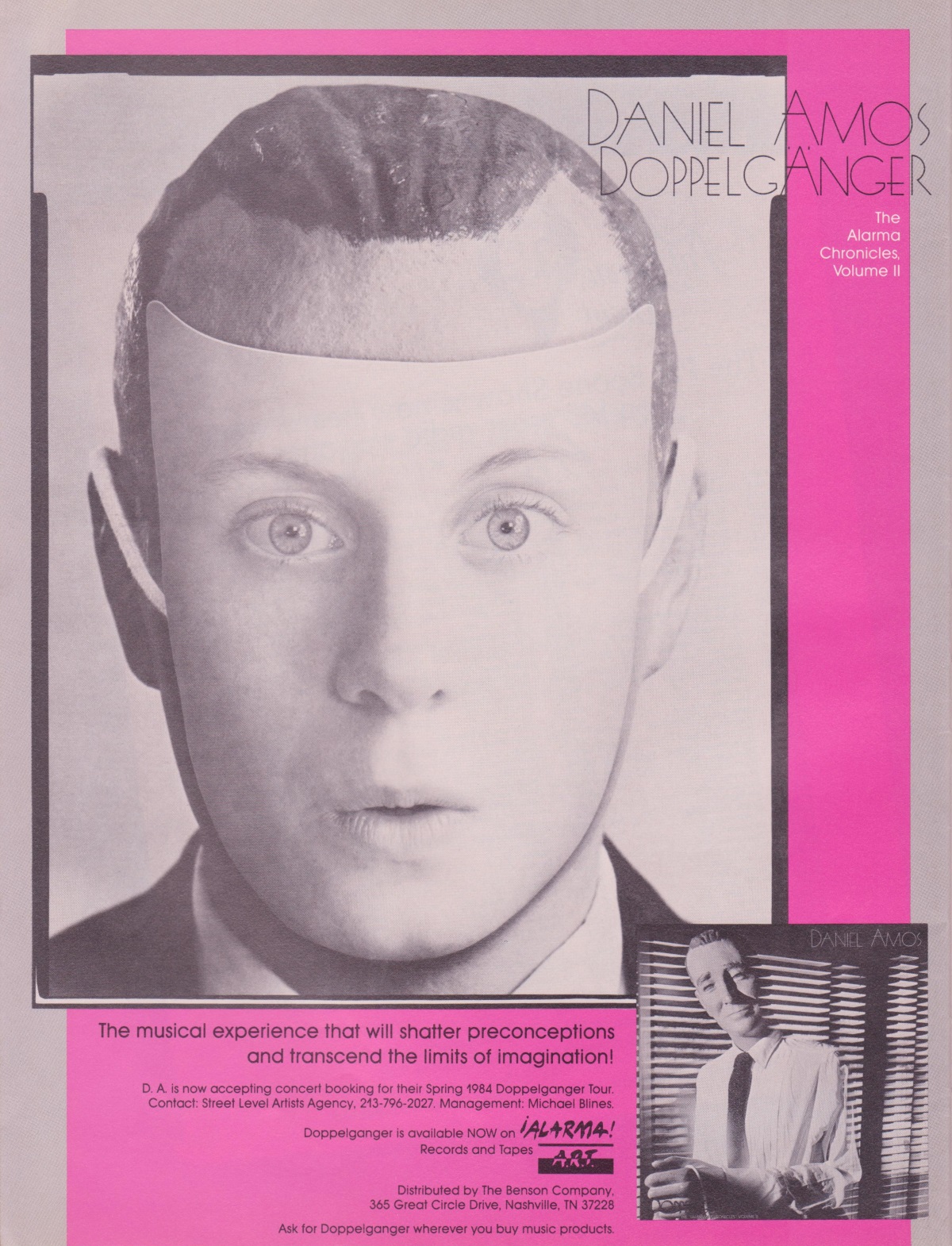 For booking information contact Street Level Artists Agency. Doppelganger The Album available on ALARMA Records and Tapes (A.R.T.) distributed by The Benson Company.