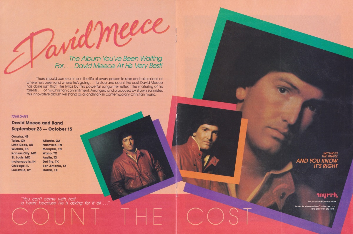A double-page advertisement for David Meece’s Count The Cost was featured in the August 1983 issue of CCM Magazine.