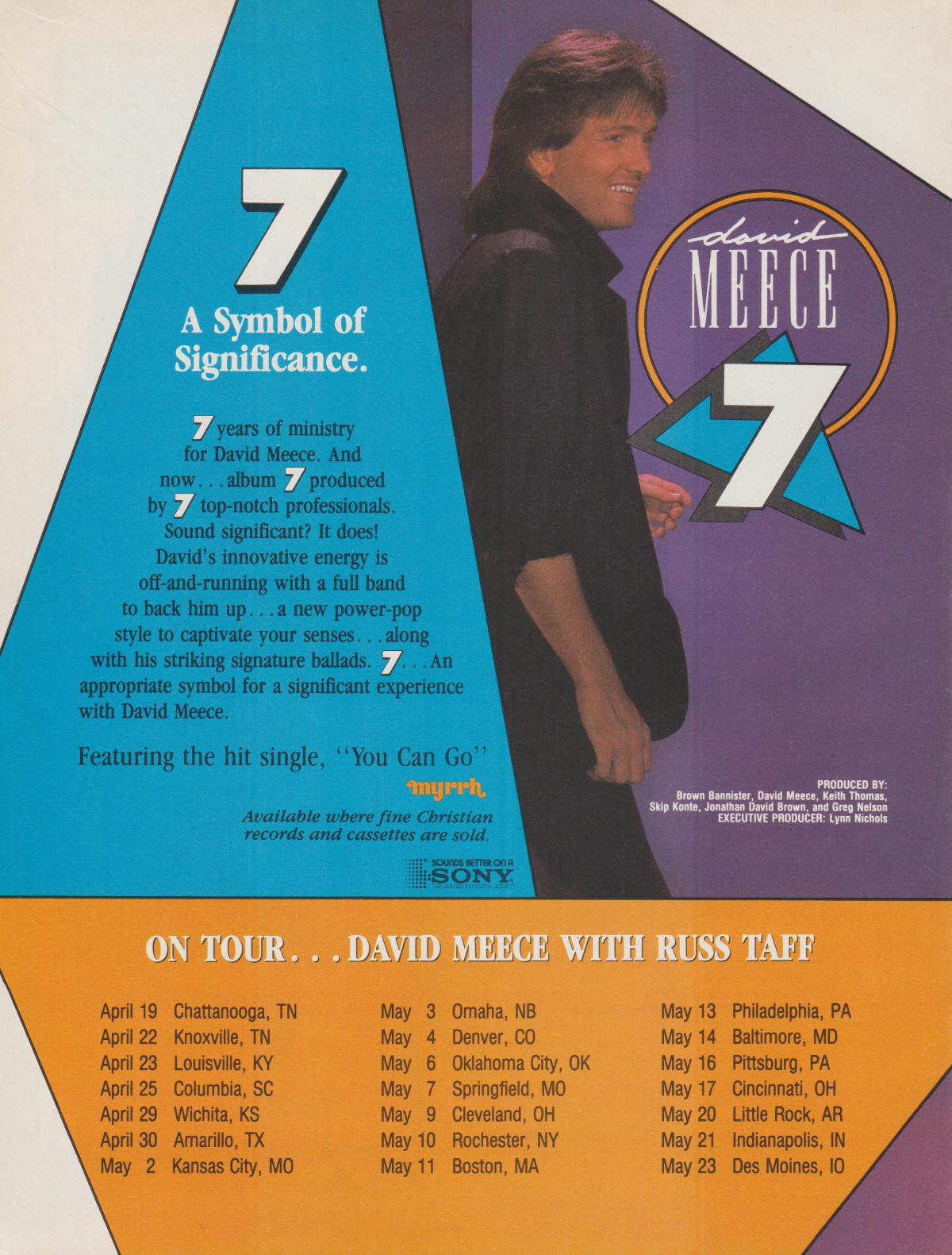A full-page advertisement for the David Meece album 7 was featured in the May 1985 issue of CCM Magazine.