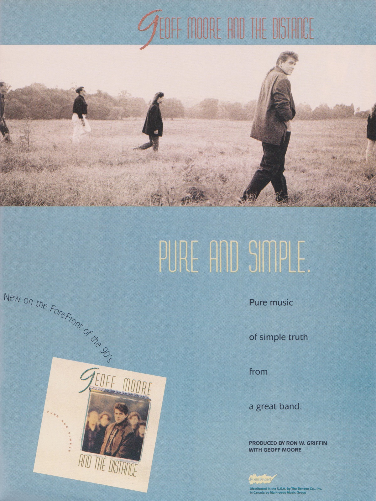 A full-page advertisement for Geoff Moore & The Distance’s Pure and Simple was featured in the December 1990 issue of CCM Magazine.