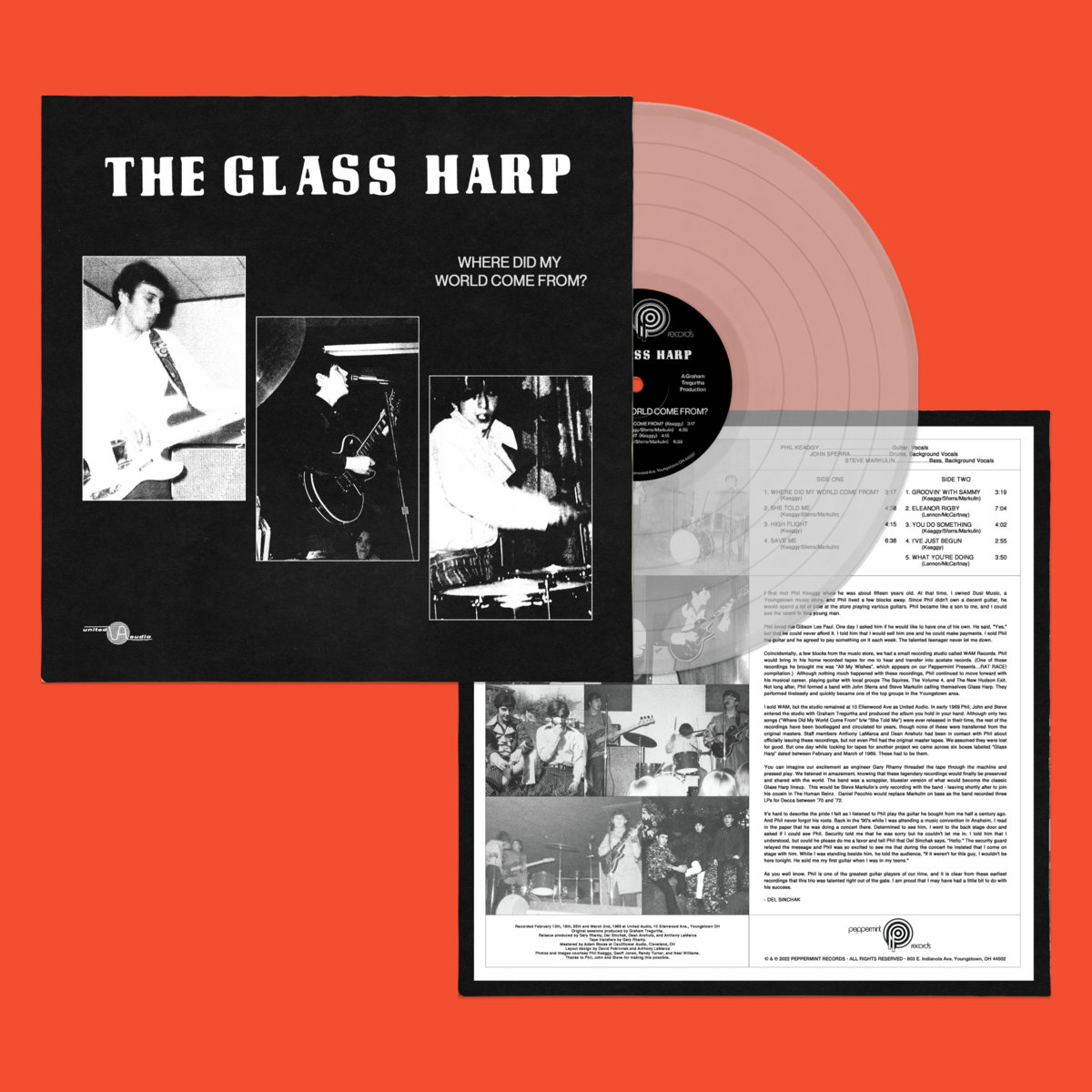 Coincidentally, a few blocks from the music store, we had a small recording studio called WAM Records. Phil would bring in his home recorded tapes for me to hear and transfer into acetate records. (One of those recordings he brought me was «All My Wishes», which appears on our Peppermint Presents…RAT RACE! compilation.) Although nothing much happened with these recordings, Phil continued to move forward with his musical career, playing guitar with local groups The Squires, The Volume 4, and The New Hudson Exit. Not long after, Phil formed a band with John Sferra and Steve Markulin calling themselves Glass Harp. They performed tirelessly and quickly became one of the top groups in the Youngstown area.