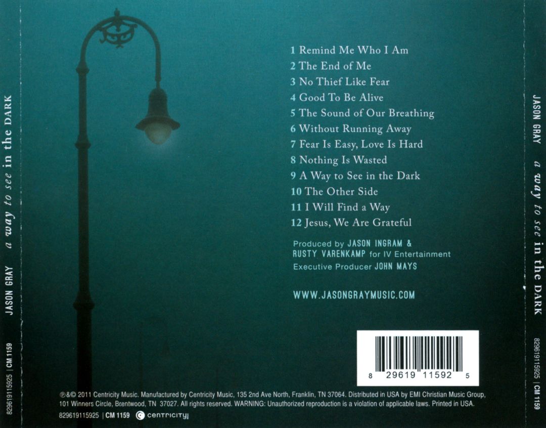 A Way to See in the Dark is the sixth full-length studio album by the American singer and songwriter Jason Gray, released on Centricity Music in September 2011, distributed in the US by EMI Christian Music Group. The album was produced by Jason Ingram and Rusty Varencamp for IV Entertainment.