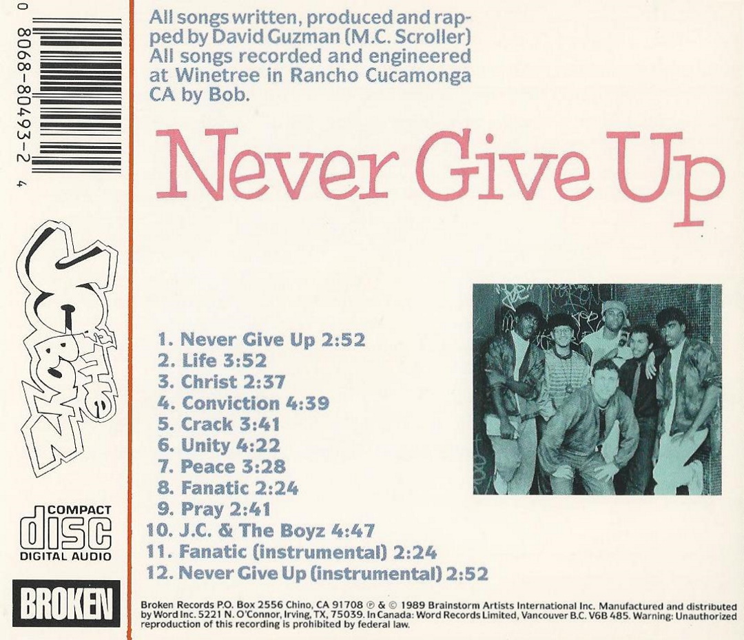 Never Give Up is the debut album by the American hip-hop group JC & The Boyz, released on Broken Records in 1989, a Brainstorm Artists International imprint manufactured and distributed by Word. The album was recorded and mixed by Bob Dire at Winetree Recording in Rancho Cucamonga, California; and was written, produced and rapped by David Guzman (M.C. Scroller). Tony Palacios of hard rock band Guardian is featured on lead guitar on “Never Give Up” and “Fanatic”.
