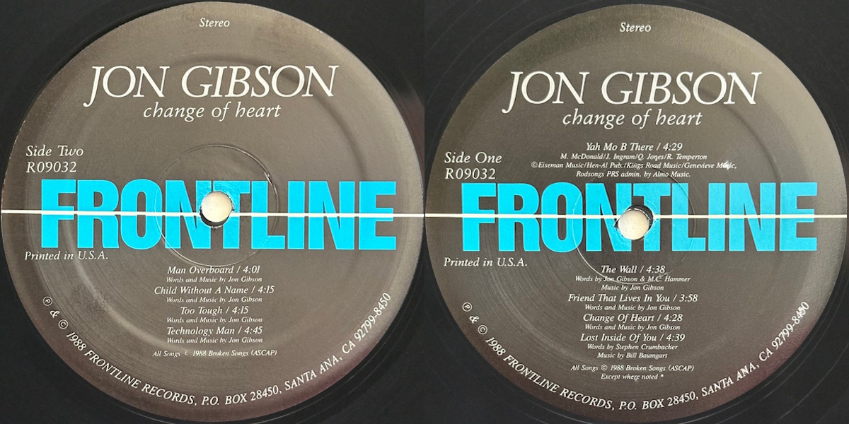 Jon Gibson - Change of Heart (Frontline Records 1988) LP labels, Side2 and Side1