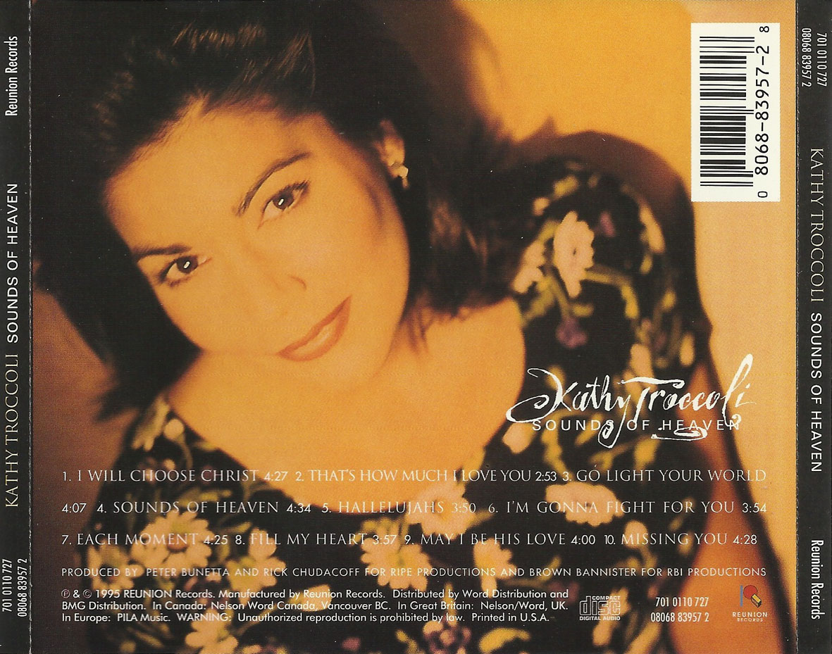 Sounds of Heaven is the sixth album by the American singer Kathy Troccoli, released on Reunion Records in 1995, distributed by Word Distribution and BMG Distribution. The album was recorded by Eric Rudd and Steve Bishir with Brown Bannister, Peter Bunetta, and Rick Chudacoff producing. Mixed by Eric Sarafin and Bishir.