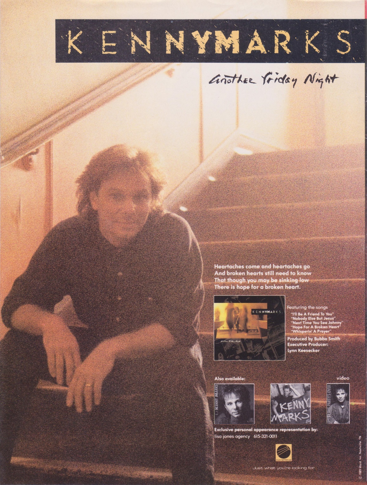 A full-page advertisement for Kenny Marks’ Another Friday Night was featured on the back cover of the December 1989 issue of CCM Magazine.