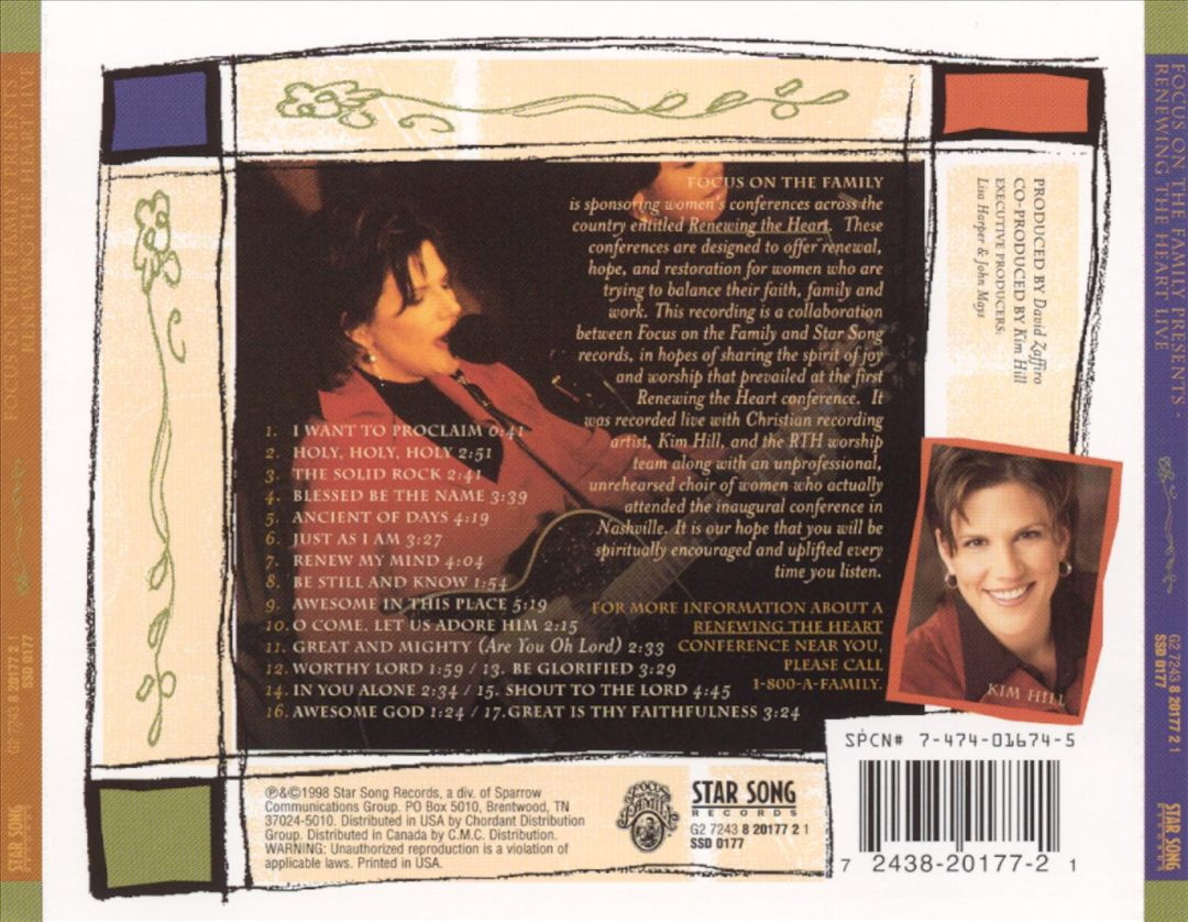 Renewing The Heart (Live) is the seventh album by American singer and songwriter Kim Hill with The Renewing The Heart Worship Team, released on StarSong Records in 1998, a division of Sparrow Communications Group, distributed by Chordant Distribution Group. The album was recorded by David Schober at Belmont Church, assisted by Ken Landers and Thomas Johnson. Mixed by J.R. McNeely at Sound Kitchen. Sequencing by Charles Meserol at Audio Genesis. Produced by David Zaffiro with Kim Hill co-producing.
