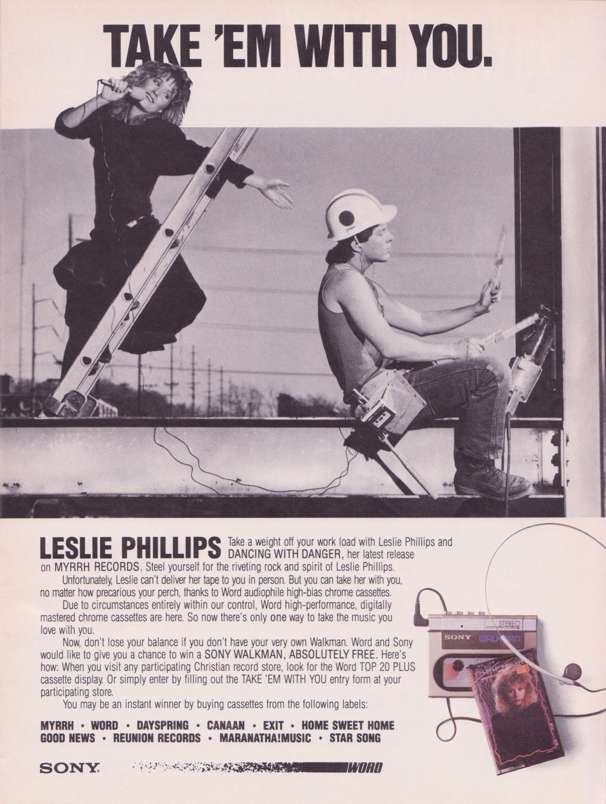 A full-page advertisement for Sony Walkman – featuring Word signed artist Leslie Phillip’s Dancing With Danger – was featured in the June 1985 issue of CCM Magazine.