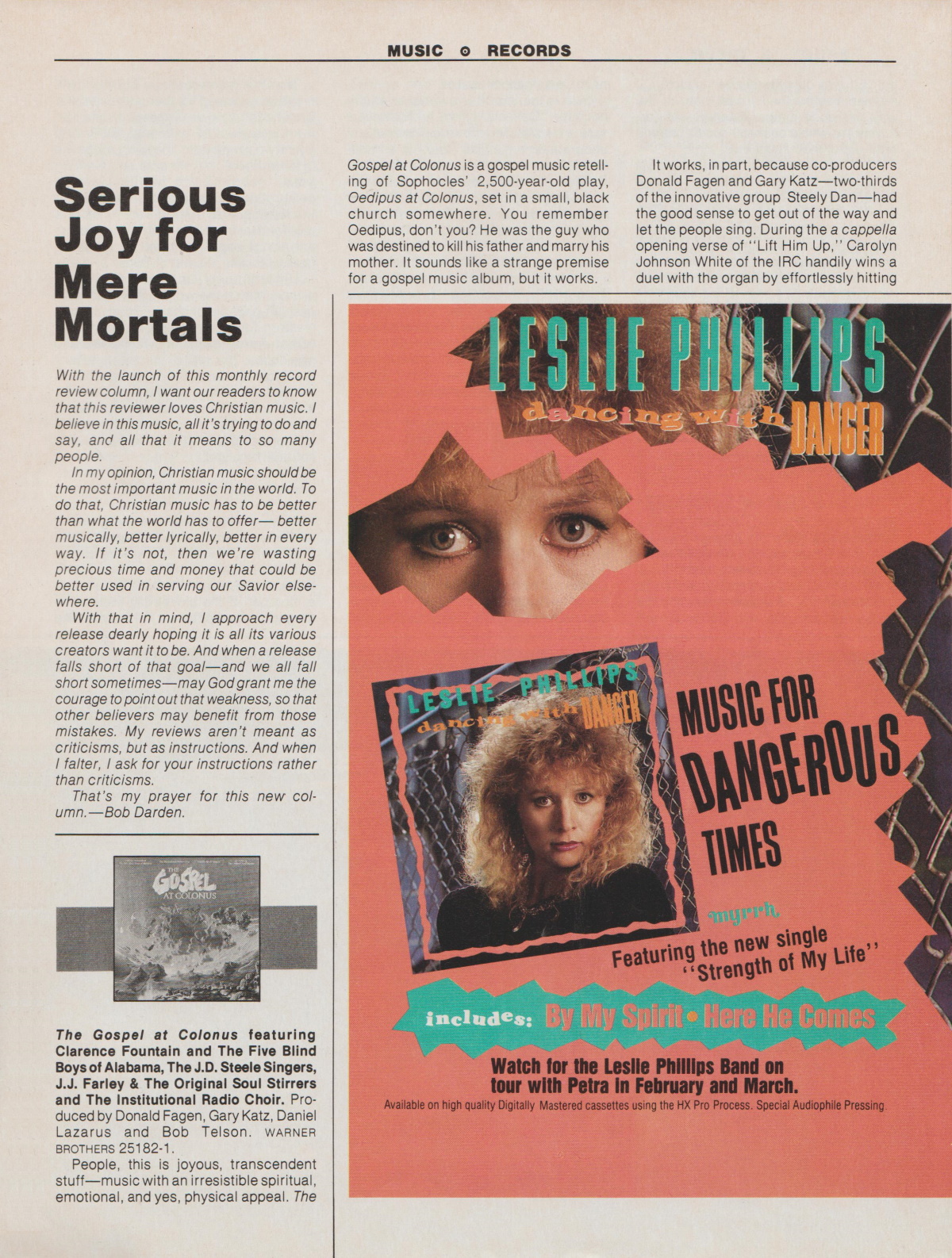 An advertisement for Leslie Phillips’ Dancing With Danger was featured in the February 1985 issue of CCM Magazine.