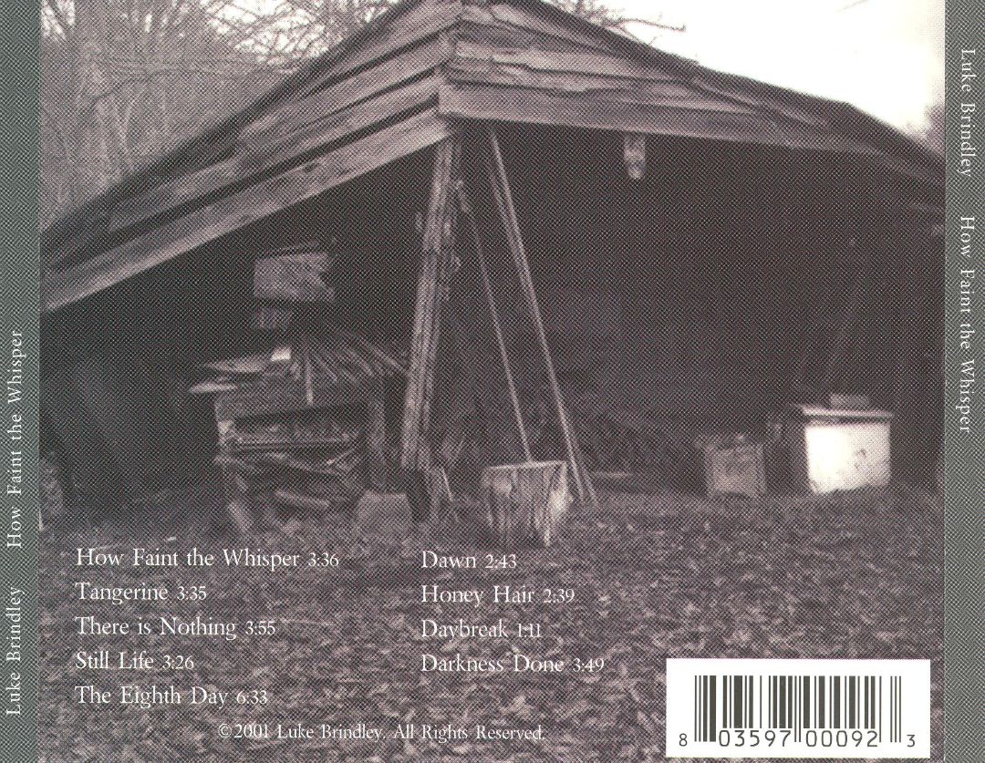How Faint the Whisper is an album by the American singer and songwriter Luke Brindley, self-released in 2001. The album was recorded at Jacob’s Ladder in Montclair, New Jersey; January – March, 2001; with Luke Brindley producing. All songs written or co-written by Luke Brindley.