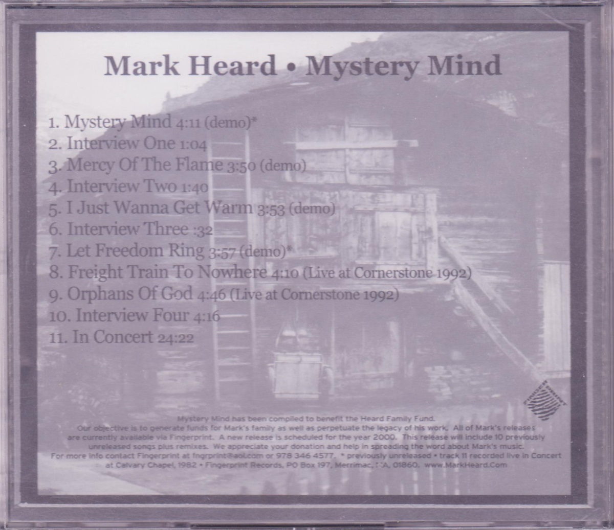 This benefit CD includes two live tracks from Mark’s final concert at Cornerstone in July 1992 («Freight Train To Nowhere» and «Orphans of God»), 25 minutes recorded live in concert at Calvary Chapel 1982, as well as 4 demos – the two previously unreleased songs «Mystery Mind» and «Let Freedom Ring», as well as «Mercy Of The Flame» and «I Just Wanna Get Warm». The CD also includes clips from a fascinating interview with Mark.