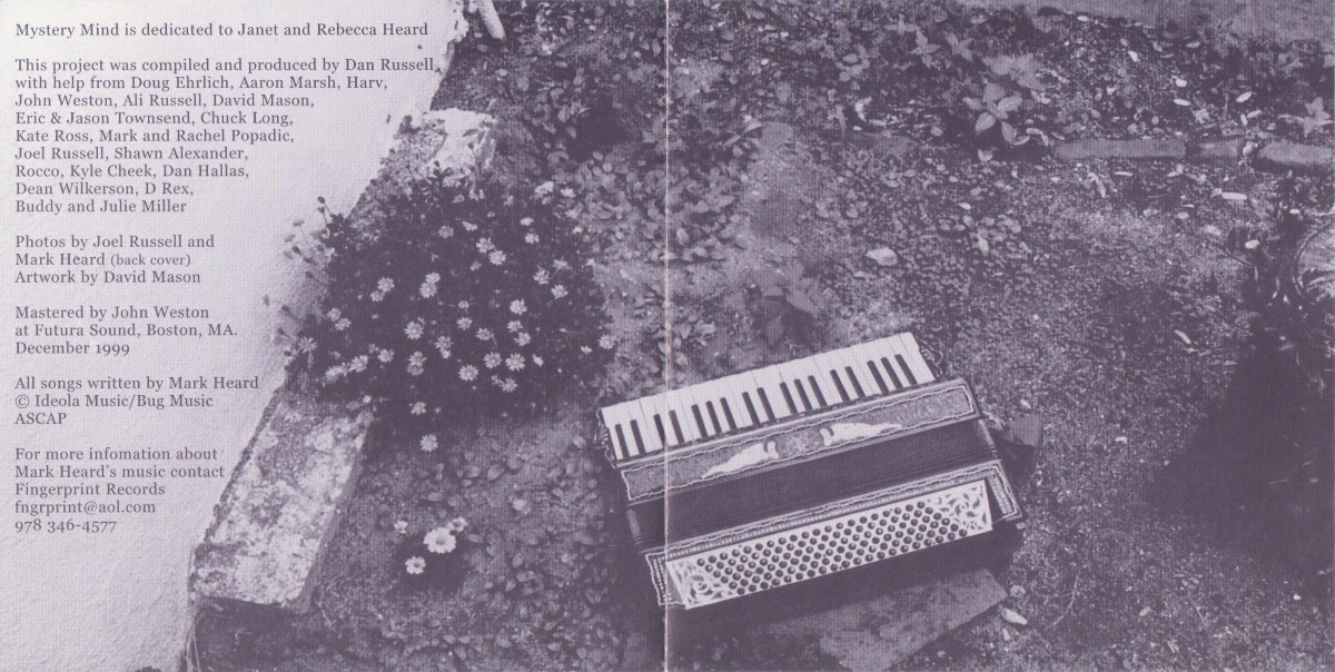 Mystery Mind is a benefit compilation CD featuring the American singer and songwriter Mark Heard, posthumously released on Fingerprint Records in 2000. This project was compiled and produced by Dan Russell with help from various friends. Mystery Mind has been compiled to benefit the Heard Family Fund. Our objective is to generate funds for Mark’s family as well as perpetuate the legacy of his work.” (excerpt from the note on the back of the CD)