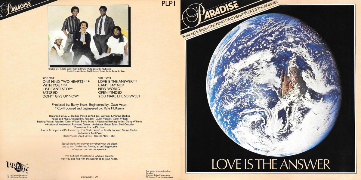 Love is the Answer is the third album by the British gospel funk group Paradise, released on the British label Priority Records in 1983, distributed by EMI. The album was recorded by Dave Aston at ICC Studios in Eastbourne, England; and was produced by Barry Evans with Rafe McKenna co-producing and engineering four tracks. Mixed at Red Bus Recording Studios, Odyssey Studios and Marcus Recording Studios in London, England. Vocals and music arranged by Paradise.