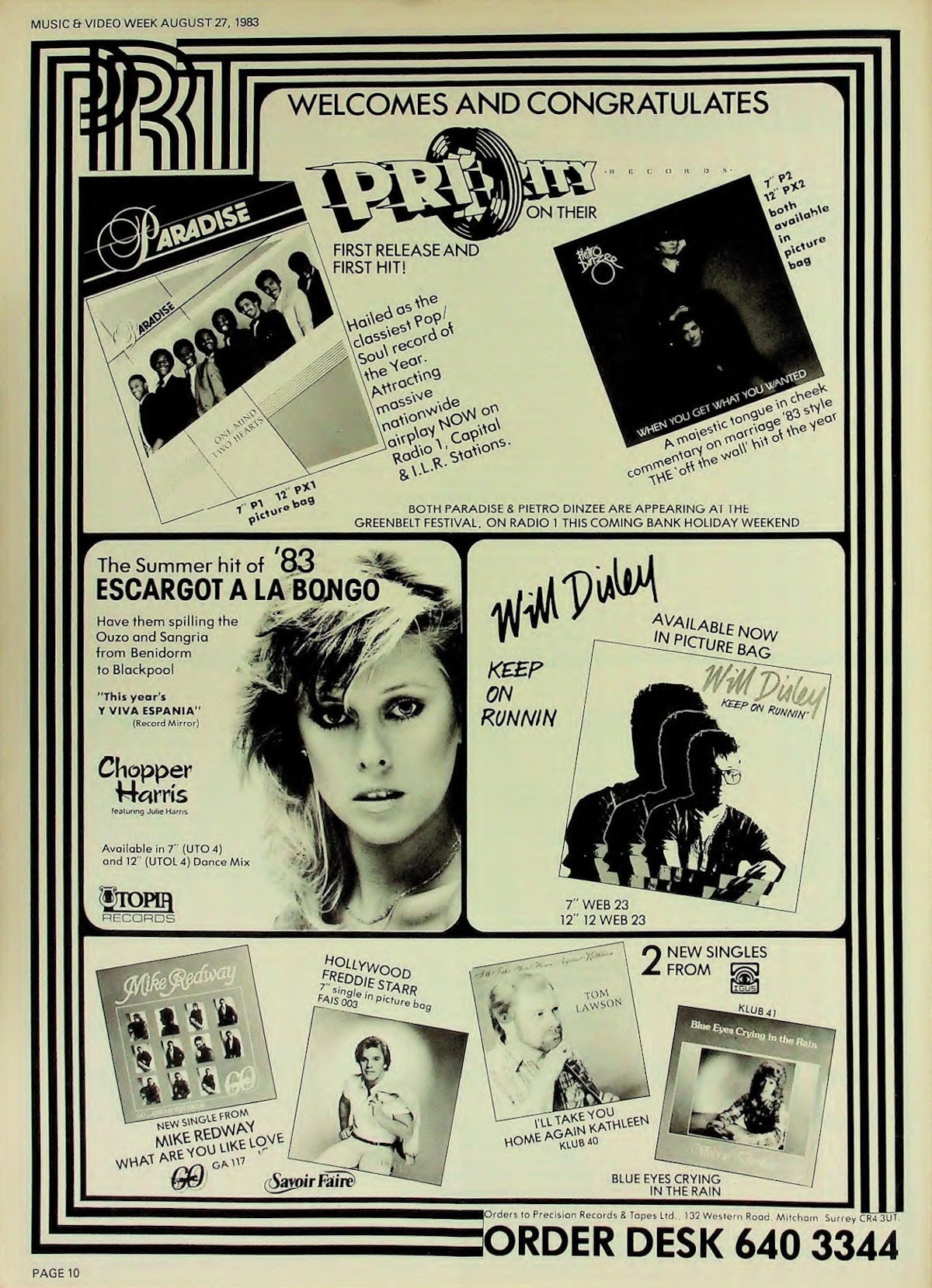 An advertisement for Paradise’s single One Mind, Two Hearts was featured in the August 27, 1983 issue of the British magazine Music & Video Week (“Europe’s leading music business paper”).