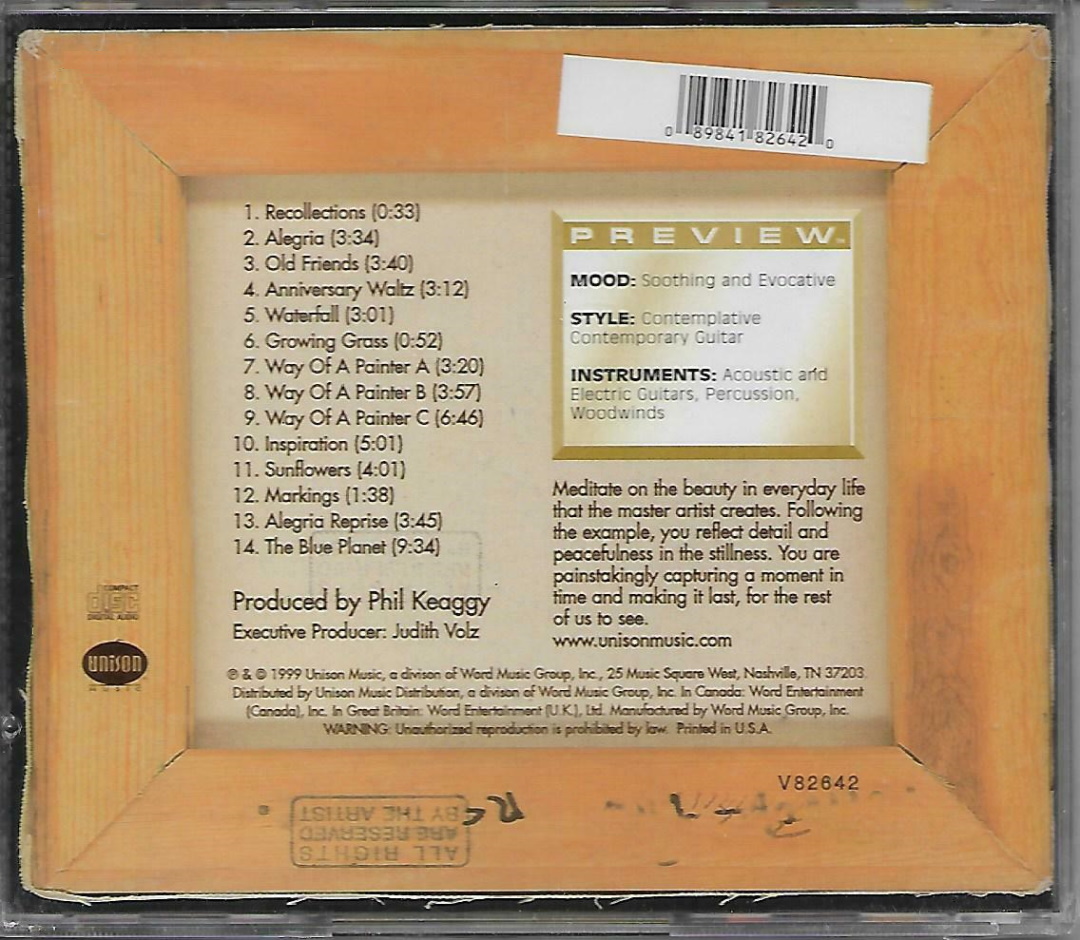Instruments: Acoustic and Electric Guitars, Percussion, WoodwindsMeditate on the beauty in everyday life that the master artist creates. Following the example, you reflect detail and peacefulness in the stillness. You are painstakingly capturing a moment in time and making it last, for the rest of us to see. [Note on the back of the CD]