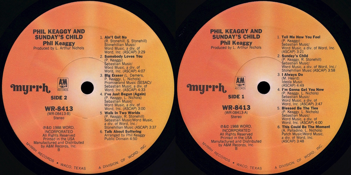 Phil Keaggy and Sunday’s Child is the eleventh solo album by the American singer, songwriter, and guitarist Phil Keaggy, released on Myrrh Records in October 1988, a division of Word. Also manufactured and distributed by A&M Records. The album was recorded between June 6th and August 15th, 1988 by Jack Joseph Puig at Music Grinder in Hollywood and at Neverland Studios in Los Alamitos, California; with Lynn Arthur Nichols producing. (Nichols actually was a member of Keaggy’s late 70s rock outfit Phil Keaggy Band, and as well a member of the short-lived rock combo Chagall Guevara in the beginning of the ’90s.) Mixed by Puig at Bill Schnee Studios in North Hollywood, California. The cover artwork pays homage to the sleeve design of The Beatles’ 1963-album With The Beatles.