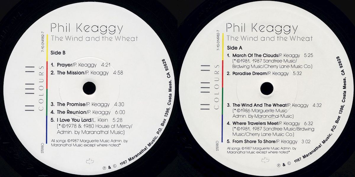 And what we have created is a collage of many musical colors. The musicians have, through their contributions, added depth and richness of various hues to the different pieces. Furthermore, I feel that the Lord was with me in the advice, counsel, and spiritual and artistic integrity of the people I worked with. ‘The Wind and The Wheat’ can therefore take its place among those creative works which form the greater tapestry of music designed to bring glory to the God who gives us life … and music. – Phil Keaggy [A note printed on the back of the album sleeve (of the Maranatha! Music edition)]