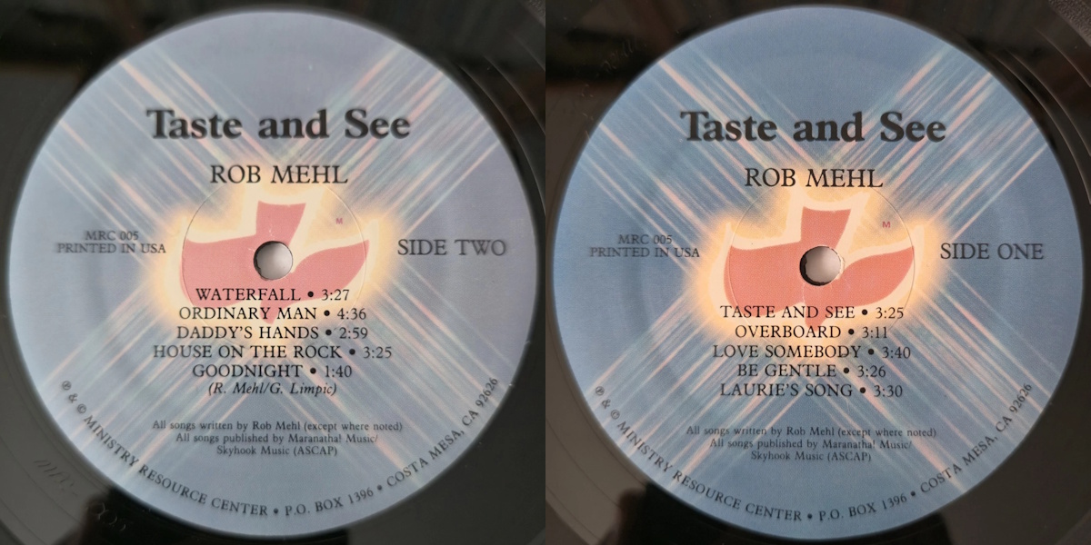 Taste and See is an album by the American singer and songwriter Rob Mehl, released on MRC Records in 1980, a sub-label of Maranatha! Music. The album was recorded at Studio Masters in Los Angeles and at Fanfare Studios in El Cajon, California; with Gerry Limpic of Limpic & Rayburn fame producing. Featuring Tom Howard on keyboards and background vocals. All song written by Rob Mehl except track B5 co-written by Gerry Limpic.
