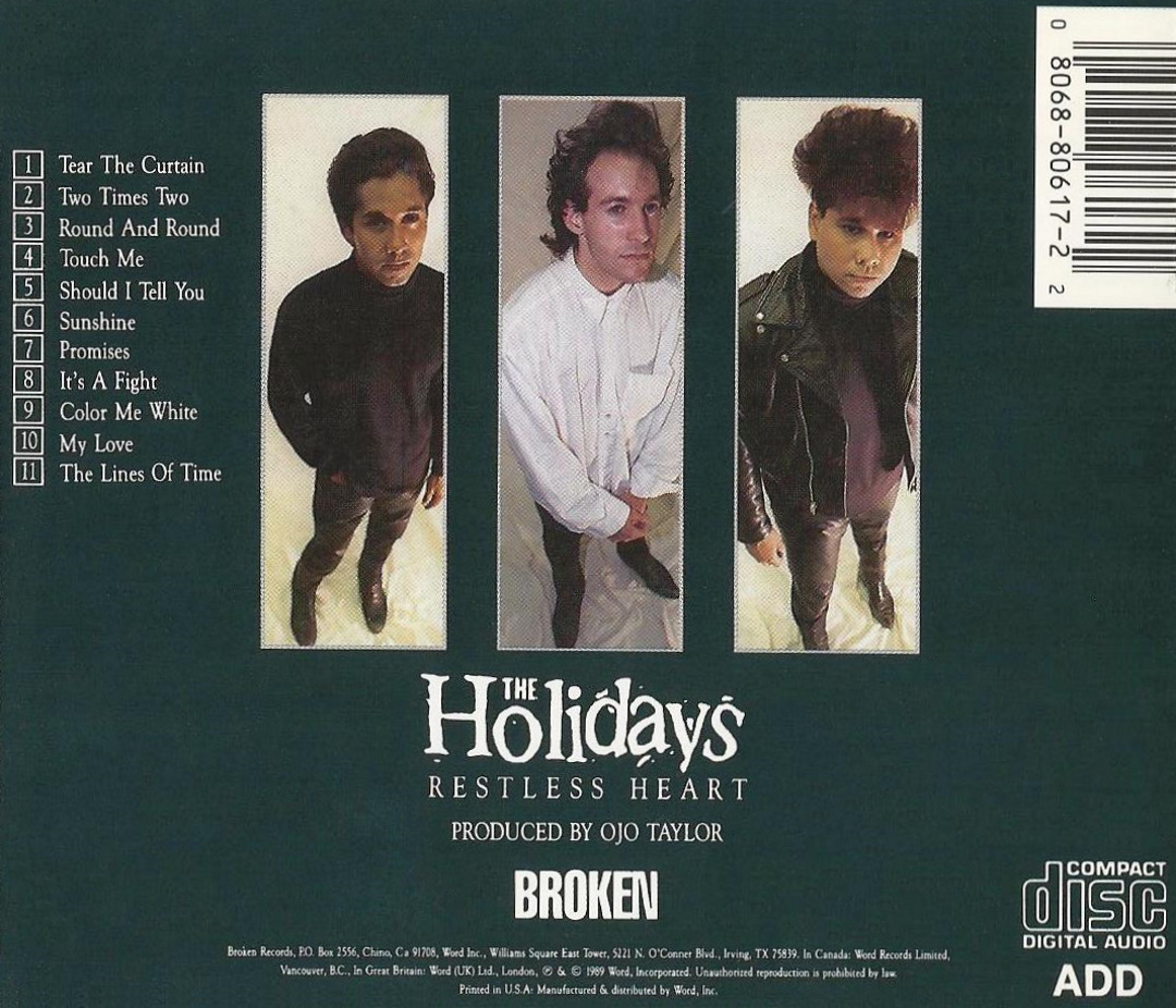 Restless Heart is the sophomore and final album by the American rock trio The Holidays, released on Broken Records in 1989, a Brainstorm Artists International imprint manufactured and distributed by Word. The album was produced and recorded by Ojo Taylor of Undercover fame at Mixing Lab B in Huntington Beach and Pakaderm West in Los Alamitos, California. Mixed at Pakaderm.