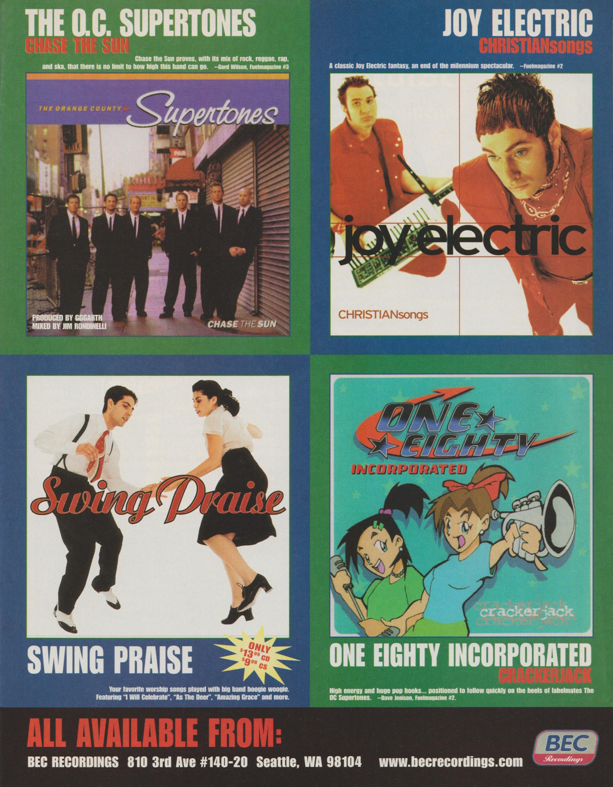 A full-page advertisement for various new releases on BEC Recordings, including The O.C. Supertones’ Chase The Sun, was featured in the April 1999 issue of CCM Magazine.