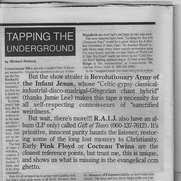 A short note on The Revolutionary Army of the Infant Jesus was featured in the Tapping the Underground column of Volume 4, Issue 3 of Harvest Rock SyndicateA short note on The Revolutionary Army of the Infant Jesus was featured in the “Tapping the Underground” column of the Volume 4, Issue 3 of Harvest Rock Syndicate.
