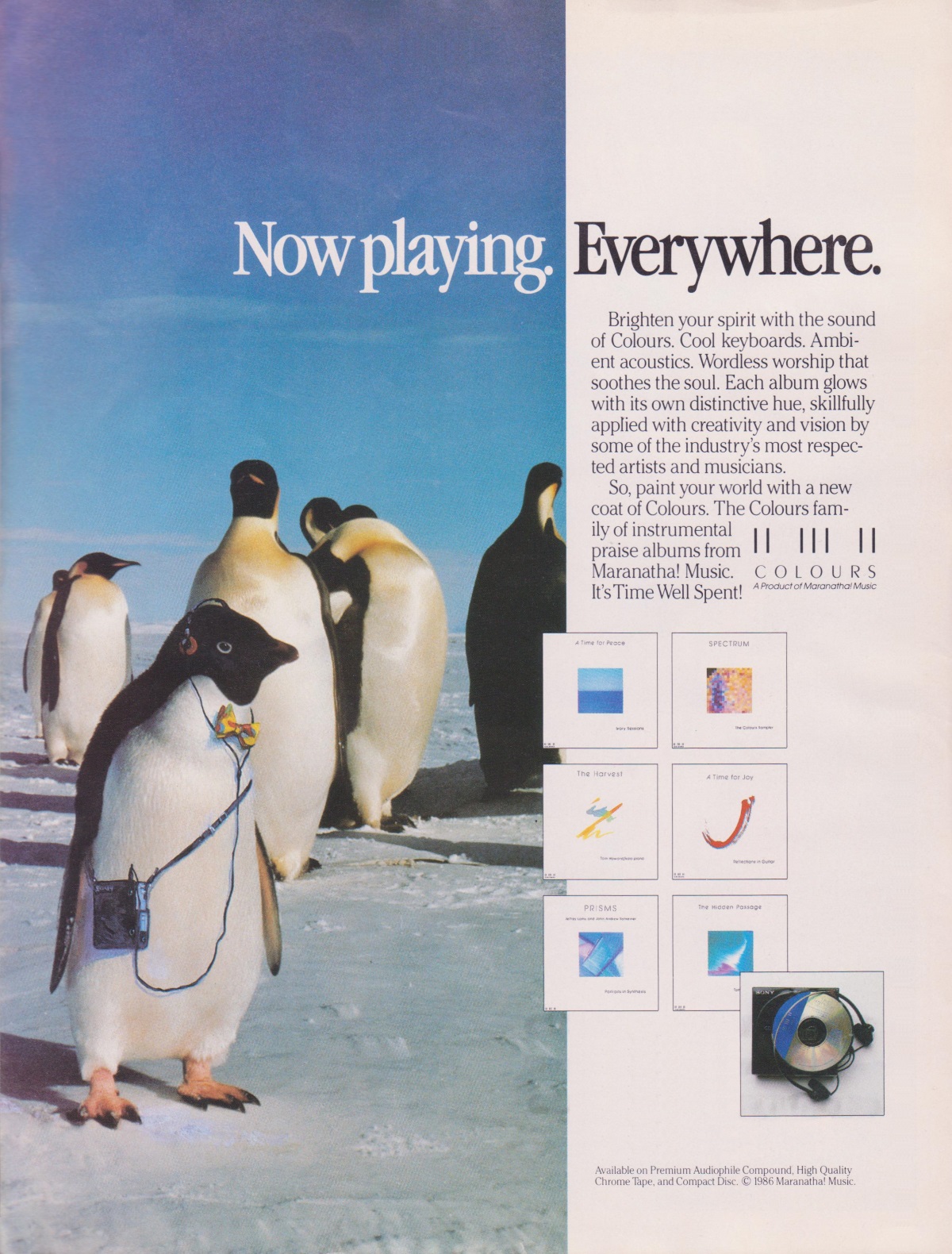 A full-page advertisement for Maranatha! Music’s Colours Instrumental Series, including Tom Howard’s albums The Harvest and The Hidden Passage, was featured in the April 1986 issue of CCM Magazine.