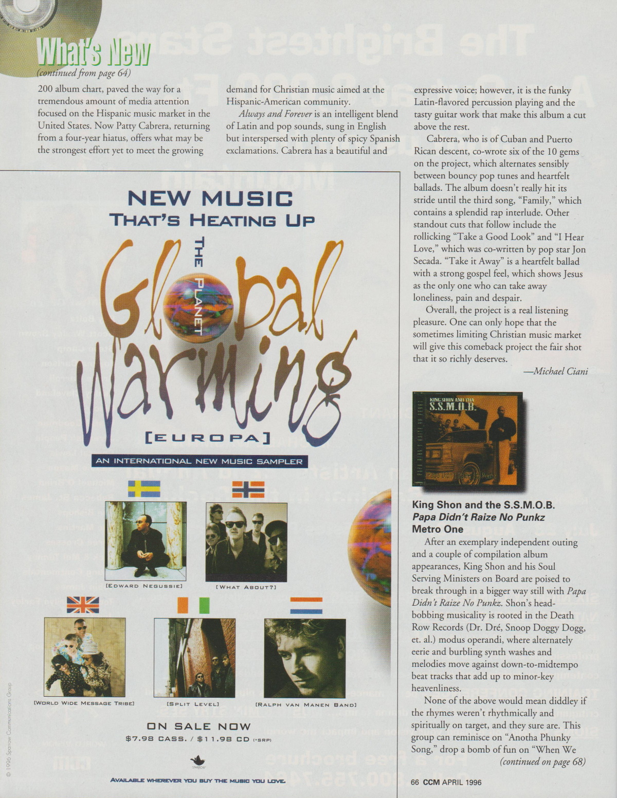 An advertisement for the multi-artist sampler album Global Warming (Europa) was featured in the April 1996 issue of CCM Magazine.