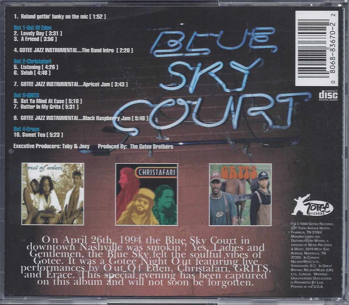 On April 26th, 1994 the Blue Sky Court in downtown Nashville was smokin’! Yes, Ladies and Gentlemen, the Blue Sky felt the soulful vibes of Gotee. It was a Gotee Night Out featuring live performances by Out of Eden, Christafari, GRITS, and Erace. This special evening has been captured on this album and will not soon be forgotten. [Note on the back of the CD]
