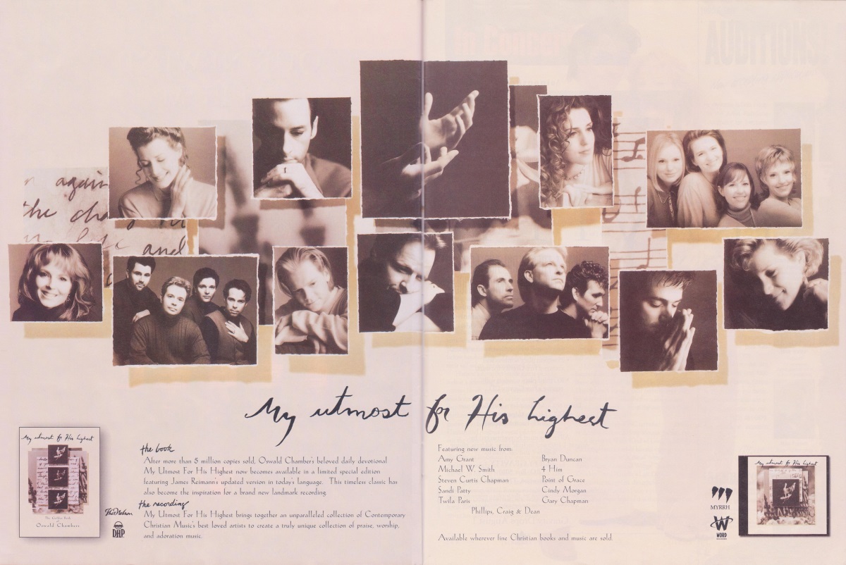 A double-page advertisement for the multi-artist compilation My Utmost for His Highest was featured in the June, July and August 1995 issues of CCM Magazine.
