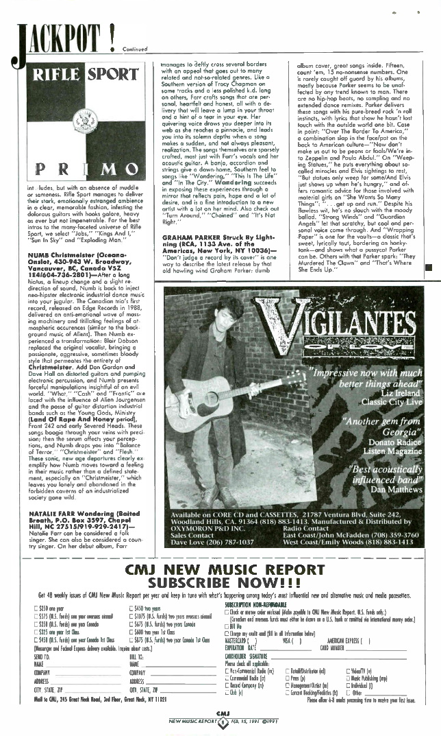 An advertisement for Vigilantes of Love's Driving the Nails was featured in the February 15, 1991 issue of CMJ New Music Report.An advertisement for Vigilantes of Love’s Driving the Nails was featured in the February 15, 1991 issue of CMJ New Music Report.