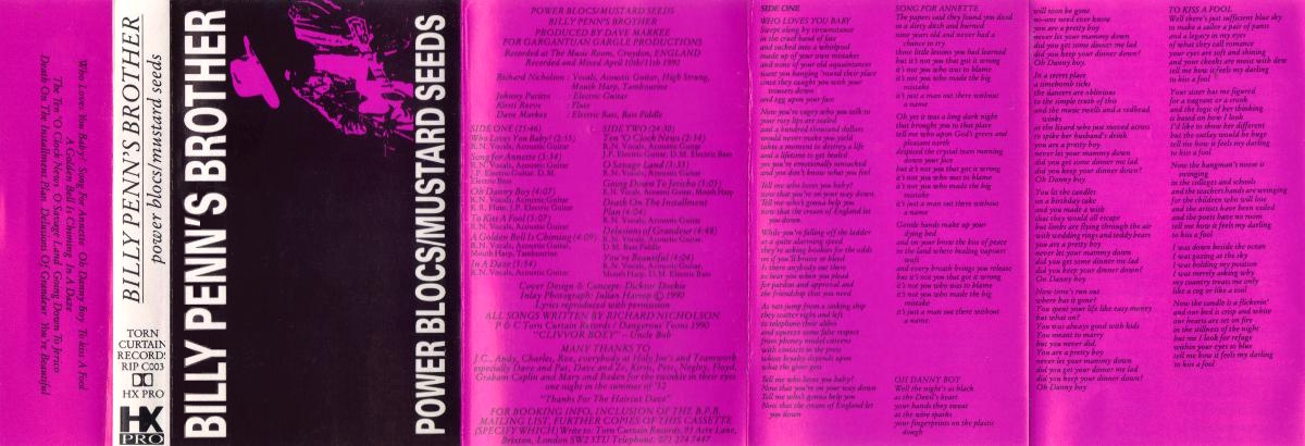 Power Blocs / Mustard Seeds is the sophomore album by the British singer/songwriter Billy Penn’s Brother (a.k.a. Richard Nicholson of Giantkiller fame), a cassette-only effort independently released on Torn Curtain Records in 1990. The album was produced by Dave Markee in his Croydon Studio. (The album was recorded in two days and much of the recording was apparently done on a first-take basis, to avoid the sterility of over-production.) All songs written by Richard Nicholson.