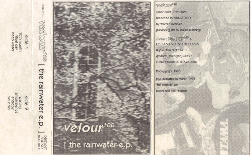 The demo cassette was released in 1995 before the band signed to Tooth & Nail Records. Shortly after the signing the band re-released the cassette independently on Distant Sounds Records (DSRC 001), though this time as Velour 100 and featuring different cover artwork (including a note saying: “also available in March 1996: “fall sounds” on tooth and nail records“). In 1997, Tooth & Nail Records released a CD-EP entitled Songs from the Rainwater E.P. featuring five out of the seven songs from the band’s original demo cassette. Two of the songs were re-recorded with new band members Jeremy Dybash and Matt Hudson, one song was remixed and a new instrumental track was added. Two songs on the CD-EP are original versions, and two songs from the original cassette were left off since they appear elsewhere (on the band’s full-length debut album Fall Sounds released in 1996 and on Tooth & Nail’s multi-artist compilation Artcore Volume Two from the same year).