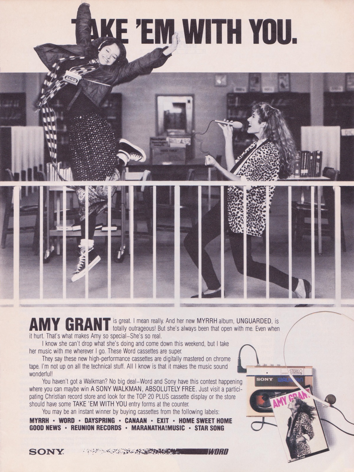 A full-page advertisement for Sony Walkman – featuring Word signed artist Amy Grant’s Unguarded – was featured in the July 1985 issue of CCM Magazine.A full-page advertisement for Sony Walkman – featuring Word signed artist Amy Grant’s Unguarded – was featured in the July 1985 issue of CCM Magazine.