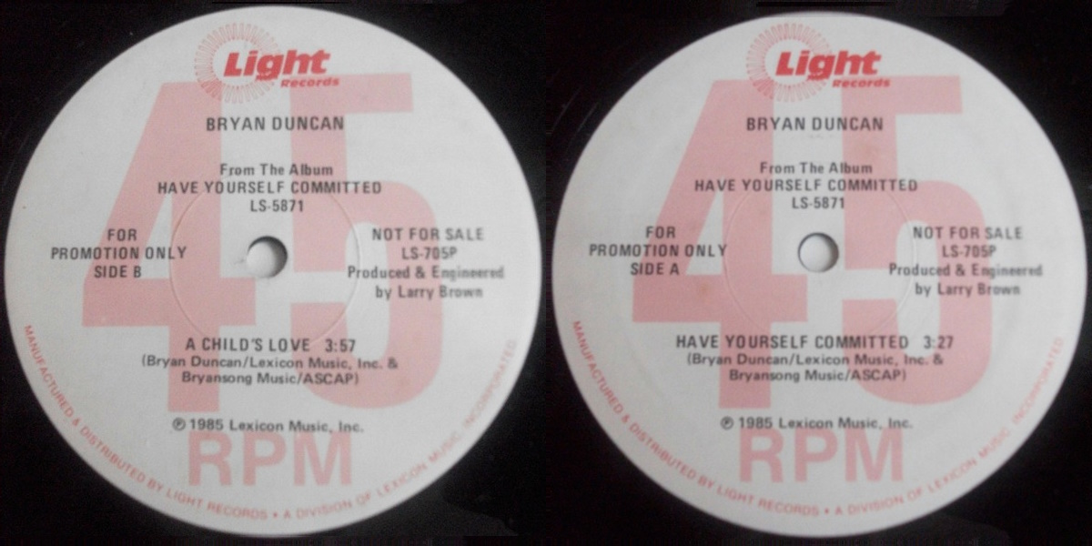 “Have Yourself Committed” – b/w “A Child’s Love” – is a two-sided 45 RPM 12-inch vinyl single by the American singer and songwriter Bryan Duncan of Sweet Comfort Band fame, released on Light Records in 1985 (catalogue number LS-705P). Both tracks were taken from Duncan’s full-length album Have Yourself Committed released on Light Records the same year, produced, recorded, and mixed by Larry Brown at Pakaderm Studios in Los Alamitos, California. Arranged by Dennis Brown, Larry Brown, and Bryan Duncan. Vocals arranged by Bryan Duncan, Larry Brown, and Bob Carlisle. Both tracks written by Bryan Duncan.