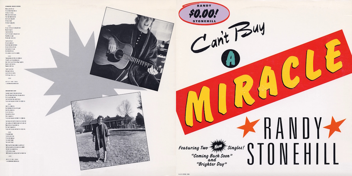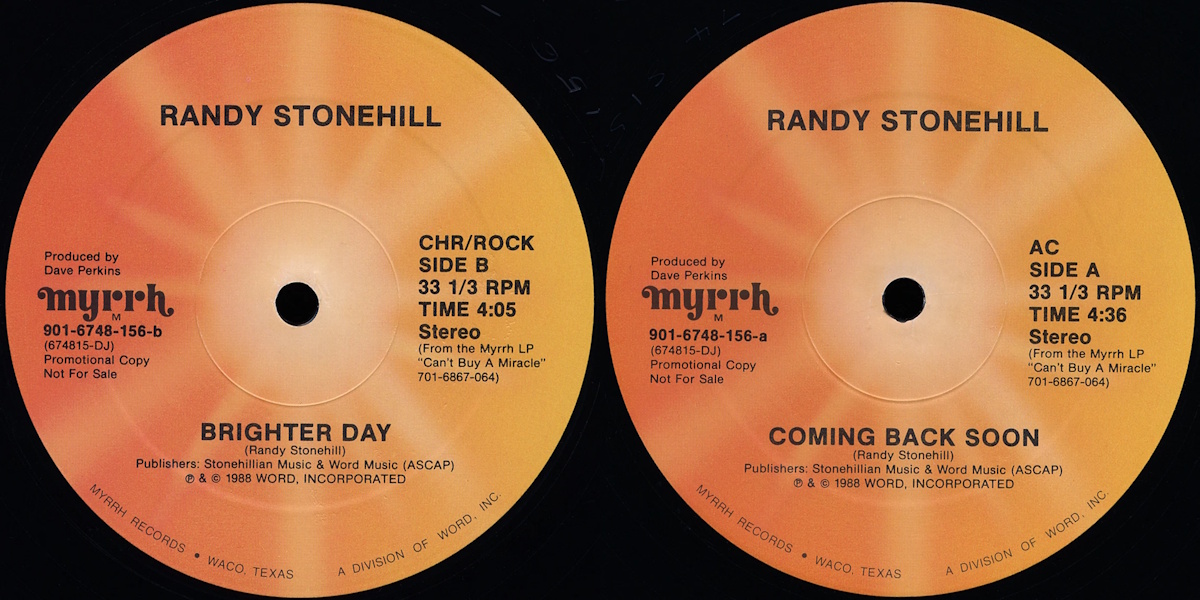 “Coming Back Soon” – b/w “Brighter Day” – is a two-sided 12-inch vinyl single by the American singer and songwriter Randy Stonehill, released on Myrrh Records in 1988, a division of Word (catalogue number 901-6748-156 / 674815-DJ). Both tracks taken from Stonehill’s full-length album Can’t Buy a Miracle released on Myrrh Records the same year, recorded by Malcolm Harper and Dave Perkins in the basement of Randy’s Rock Bunker in Brentwood, Tennessee; with Perkins producing. Mixed by Perkins and Harper at The Reelsound Truck in Austin, Texas. Both tracks written by Randy Stonehill.
