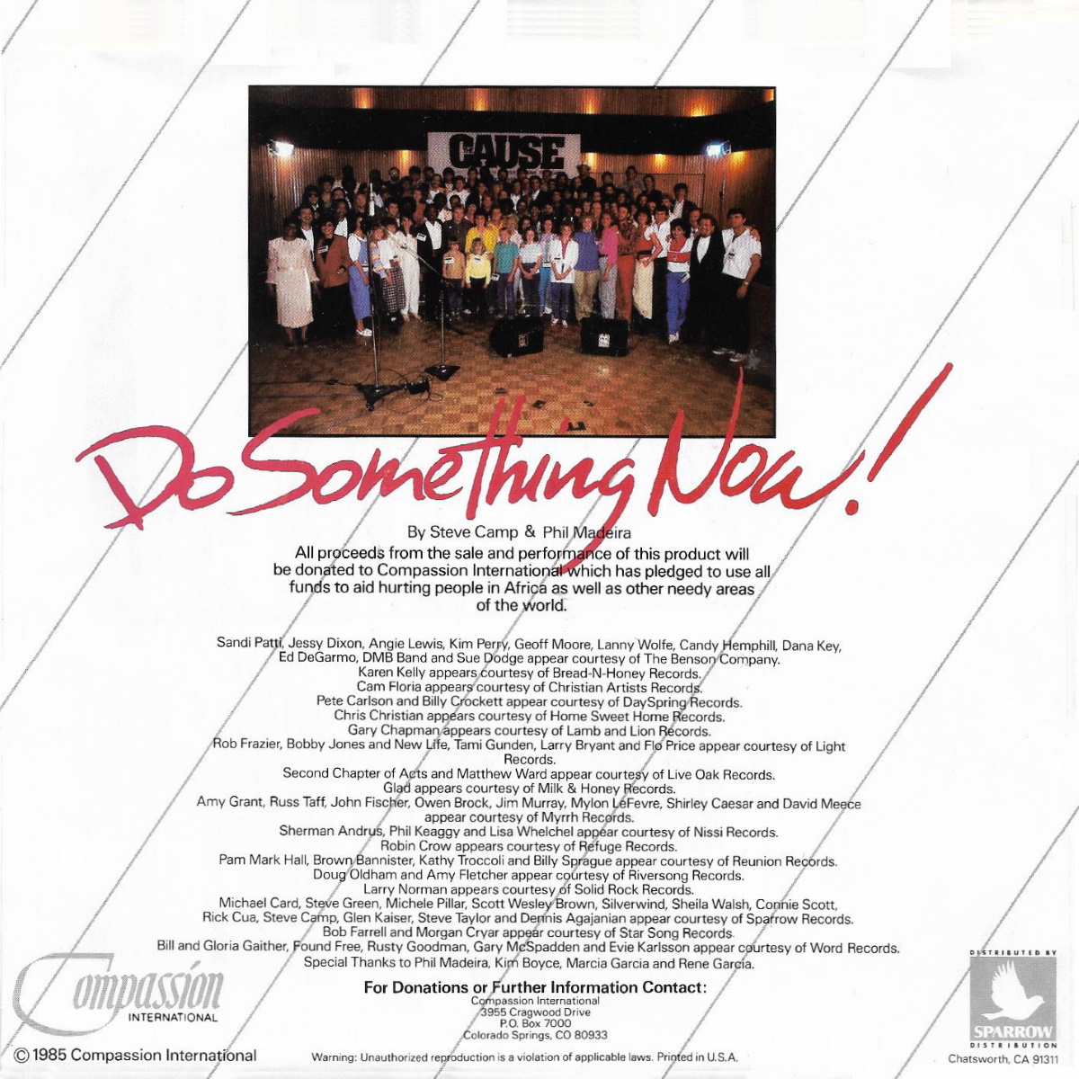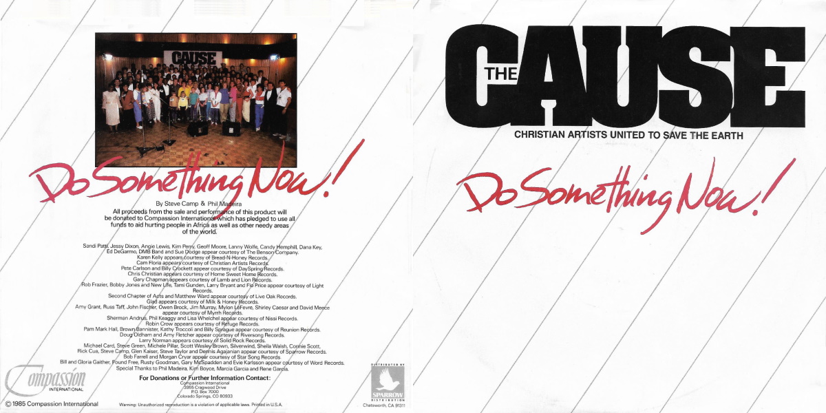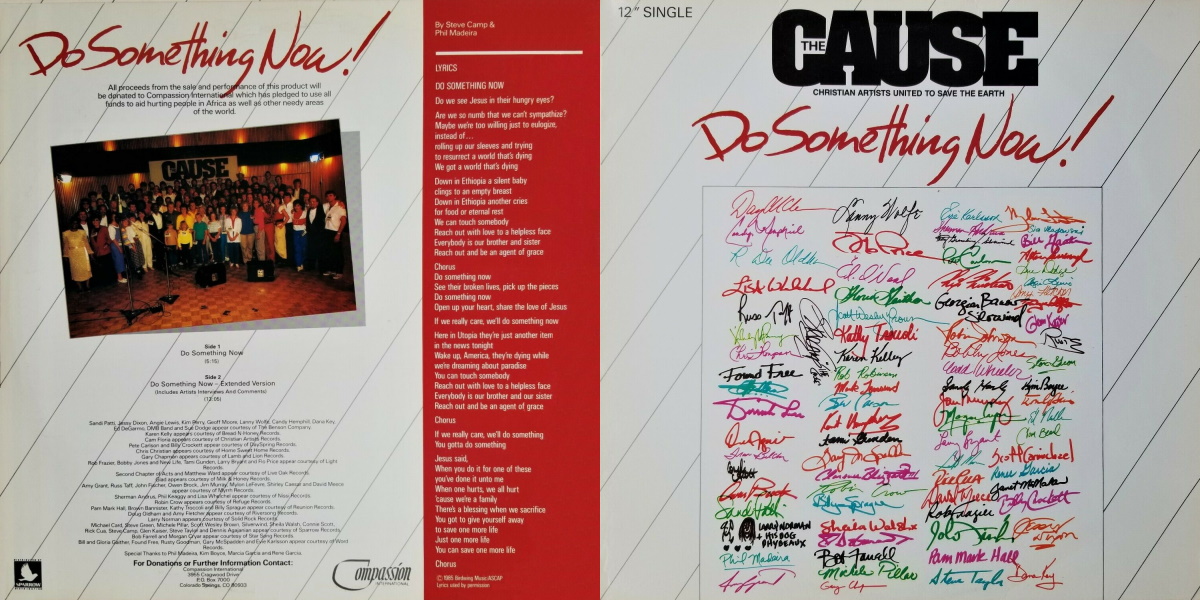 The one-time assemblage of Christian artists known as CAUSE (Christian Artists United to Save the Earth) was organized by Steve Camp as a specifically Christian parallel to the Band Aid project launched by Bob Geldof. The latter program brought artists in the United Kingdom together to sing the song «Do They Know It’s Christmas?» as a benefit for victims of the ongoing famine in Ethiopia. A true media event, it inspired numerous such programs, the most famous of which was USA for Africa, a collection of American artists who sang «We Are the World», written by Michael Jackson and Lionel Richie. The officially Christian version of this trend included ninety artists, and the proceeds from their song «Do Something Now» (written by Camp and Phil Madeira) went to the hunger organization Compassion International. The project was accorded the President’s Merit Award. [Quote from Mark Allan Powell’s “Encyclopedia of Contemporary Christian Music”]