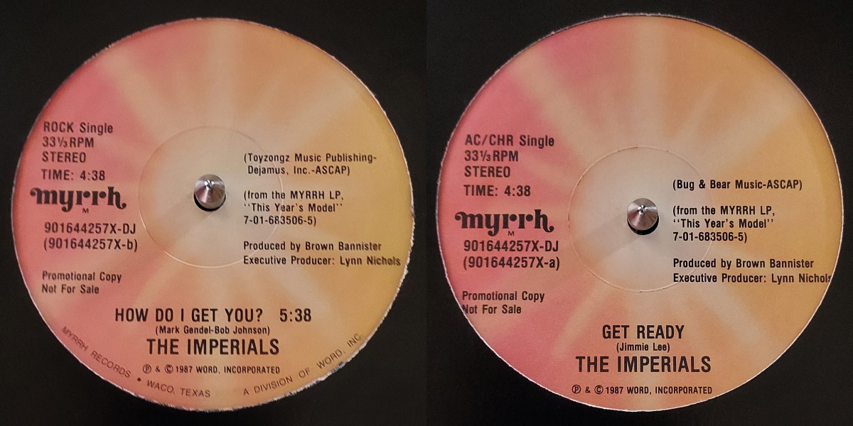 Get Ready – b/w “How Do I Get You?” – is a two-sided 33⅓ RPM 12-inch vinyl single by the American pop quartet The Imperials, released on Myrrh Records in 1987, a division of Word (catalogue number 901644257X-DJ). Both tracks were taken from the band’s full-length album This Year’s Model released on Myrrh Records the same year (manufactured and distributed by both Word and A&M Records), recorded by Steve MacMillan at Ocean Way Recording in Los Angeles, California; with Brown Bannister producing. Mixed by Nicholas Froome at Blue Jay Recording Studio in Boston, Massachusetts. The titled track was written by band member Jimmie Lee, with the track on the flip-side written by Mark Gendel and Bob Johnson.