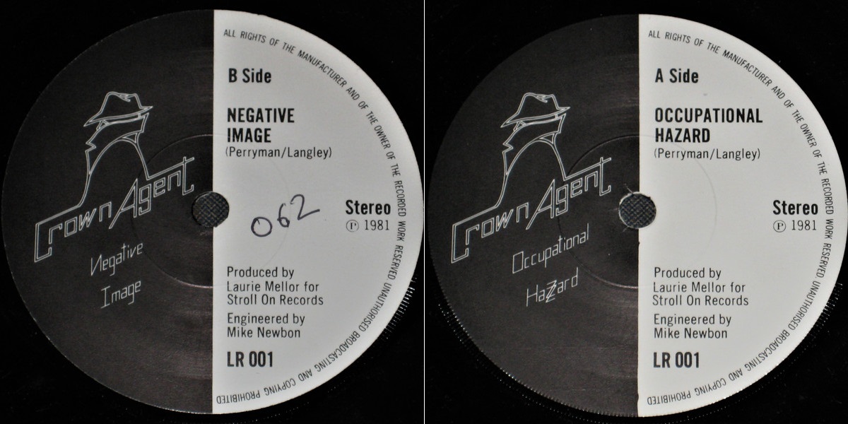 Occupational Hazard – b/w “Negative Image” – is a two-sided 7-inch vinyl single by the British new wave/ska combo Crown Agent, independently released in 1981. Both tracks were engineered by Mike Newbon with Laurie Mellor of Ishmael United fame producing for Stroll On Records. Both tracks written by Perryman/Langley.