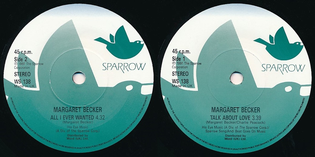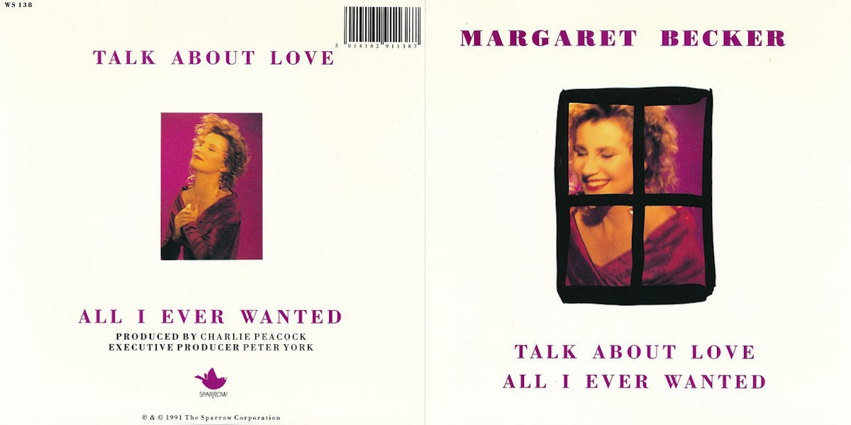 “Talk About Love” – b/w “All I Ever Wanted” – is a two-sided 7-inch vinyl single by the American singer and songwriter Margaret Becker, released in the UK on Sparrow Records in 1991, distributed by Word UK (catalogue number WS 138). Both tracks taken from Becker’s full-length album Simple House released on Sparrow the same year, recorded by Bill Deaton at OmniSound Recording Studio in Nashville, Tennessee; with Charlie Peacock producing. The track on the A-side co-written by Margaret Becker and producer Charlie Peacock with the track on flip-side written by Becker only.