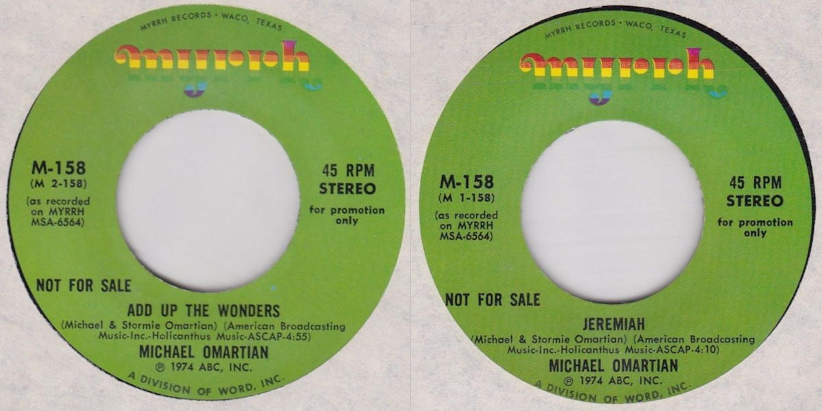 “Jeremiah” – b/w “Add Up The Wonders” – is a two-sided 7-inch vinyl single by the American singer, songwriter, keyboardist, and producer Michael Omartian, released on Myrrh Records in 1974 (catalogue number M-158). Both tracks taken from Michael Omartian’s full-length album White Horse released the same year on ABC Dunhill Records (and re-issued later the same year by Myrrh Records, a division of Word), recorded by Tommy Vicari, Michael Lietz, and John Guess at Sound Labs and Hollywood Sound in Hollywood, California; with Michael Omartian producing and arranging. Music written by Michael Omartian with lyrics written by his wife Stormie.