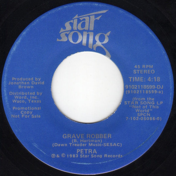 Grave Robber is a 7-inch vinyl single by the American rock band Petra, released on StarSong Records in 1983, distributed by Word (catalogue number 9102118599-DJ). The track was taken from the band’s full-length album Not of this World released on StarSong Records the same year, produced, recorded, and mixed by Jonathan David Brown at Rivendell Sound Recorders in Pasadena, Texas. The song was written by Petra guitarist Bob Hartman