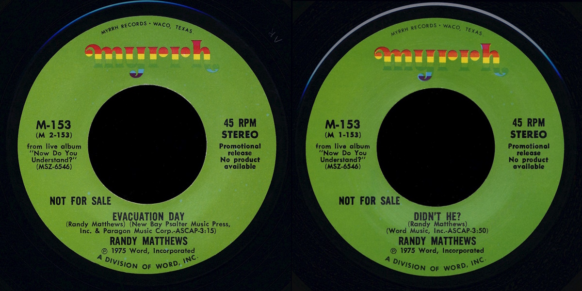 “Didn’t He?” – b/w “Evacuation Day” – is a two-sided 7-inch vinyl single by the American singer and songwriter Randy Matthews, released on Myrrh Records in 1975, a division of Word (catalogue number M-153). Both tracks were taken from Matthew’s live album Now Do You Understand? released on Myrrh Records the same year, a double album featuring an acoustic solo performance by Matthews recorded February 6, 1975 at a college in New York with Wes Yoder producing. Both songs written by Randy Matthews.