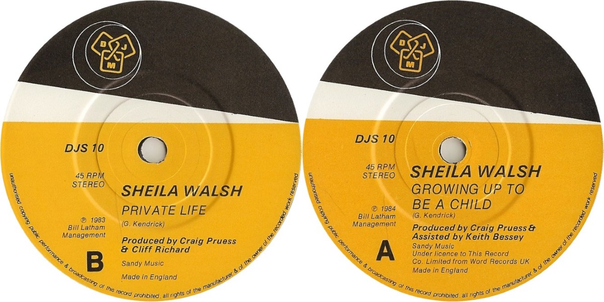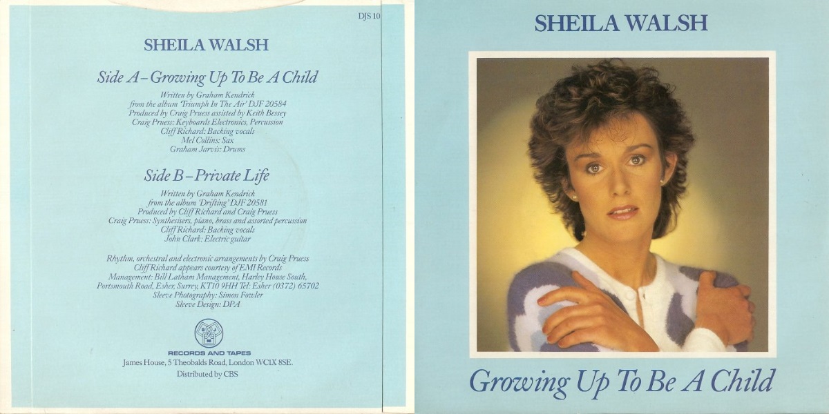 Growing Up to be a Child – b/w “Private Life” – is a two-sided 7-inch vinyl single by the British singer Sheila Walsh, released on DJM in May 1984 (catalogue number DJS 10). The A-side was lifted from Sheila Walsh’s full-length album Triumph in the Air released on Sparrow Records the same year, recorded by Keith Bessey at at Strawberry Studios a well as Cloud 9 and Jacobs Studios in Surrey; England, with Craig Pruess producing, assisted by Bessey. “Private Life”, the flip-side, was lifted from Walsh’s full-length album Drifting released on Myrrh Records the previous year (and as well distributed by DJM into mainstream record shops in the UK), recorded by Keith Bessey at Riverside, Strawberry, Ramp and Sonoptics Studios in England, with Cliff Richard and Craig Pruess producing. Both tracks written by the British singer-songwriter Graham Kendrick.