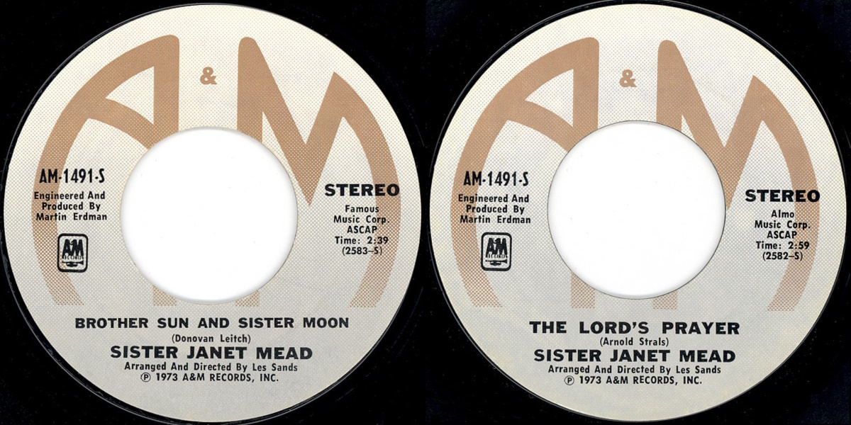“The Lord’s Prayer” – b/w “Brother Sun And Sister Moon” – is a two-sided 7-inch vinyl single by the Australian singer Sister Janet Mead, released on A&M Records in 1974 (catalogue number AM-1491-S). It was recorded at Festival’s own studio in Sydney, Australia, with Martin Erdman producing and engineering. Arranged and directed by Les Sand. The track on the A-side was written by Arnold Strals while the track on the flip-side was written by Donovan Leitch.