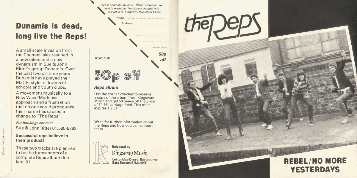 “Rebel” – b/w “No More Yesterdays” – is a two-sided 7-inch vinyl single by the British pop/rock/new wave combo The Reps, released on Kingsway Music in 1980 (catalogue number KMS 910). According to a note on the back of the single cover, “these two tracks are planned to be the forerunners of a complete Reps album due late ’81.” Their full-length album, entitled Bad Boy at School, was released by Kingsway in 1983.