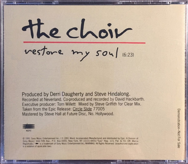 Restore My Soul is a CD-single by the American alternative rock band The Choir, released on Sony Music Entertainment, manufactured and distributed by Epic, a division of Sony Music (catalogue number ESK 3083). The track was taken from the band’s full-length album Circle Slide released on Myrrh Records the same year, also manufactured and distributed by Epic, a division of Sony Music. The album was recorded by Dave Hackbarth at Neverland Studios in Los Alamitos, California; and was produced by band members Derri Daugherty and Steve Hindalong with Hackbarth co-producing. Mixed by Steve Griffith of Vector fame. The music was co-written by band members Daugherty and Hindalong with the latter providing the lyrics.