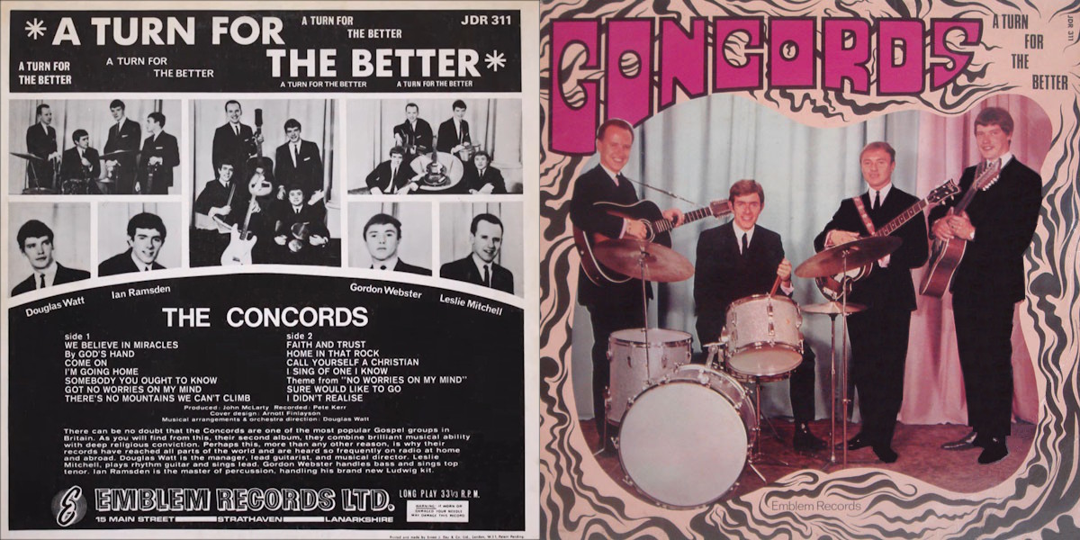 There can be no doubt that the Concords are one of the most popular Gospel groups in Britain. As you will find from this, their second album, they combine brilliant musical ability with deep religious conviction. Perhaps this, more than any other reason, is why their records have reached all parts of the world and are heard so frequently on radio at home and abroad. Douglas Watt is the manager, lead guitarist, and musical director. Leslie Mitchell plays rhythm guitar and sings lead. Gordon Webster handles bass and sings top tenor. Ian Ramsden is the master of percussion, handling his brand new Ludwig kit. [A note printed on the back of the LP sleeve]