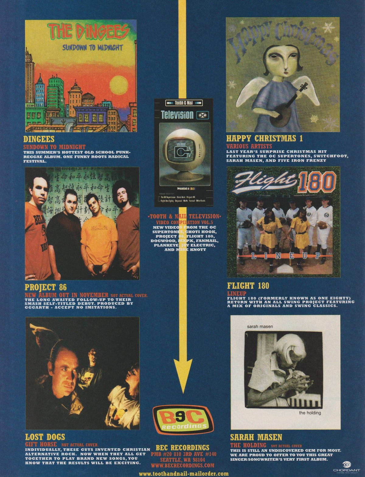 A full-page advertisement for various new releases on BEC Recordings, including Lost Dogs’ Gift Horse, was featured in the October 1999 issue of CCM Magazine.
